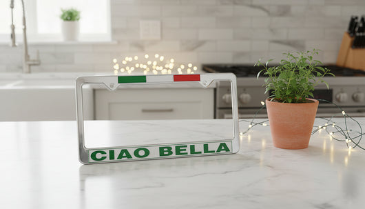 ✅ Chrome metal frame with Italian flag and “CIAO BELLA” design