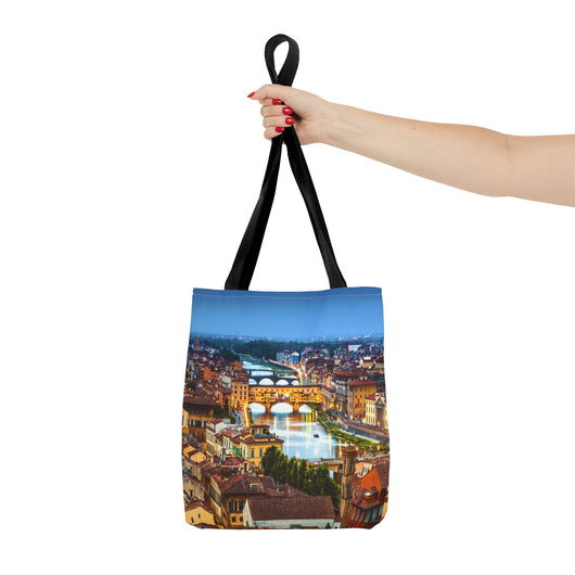 Carry a slice of Florence with you—the warm curve of the Arno, the graceful bridge, and rooftops that glow at sunset. This tote brings that quiet city moment into everyday life: slipping onto your shoulder for market runs, city walks, or the commute. The printed scene invites a slow breath, a small daydream between errands.
